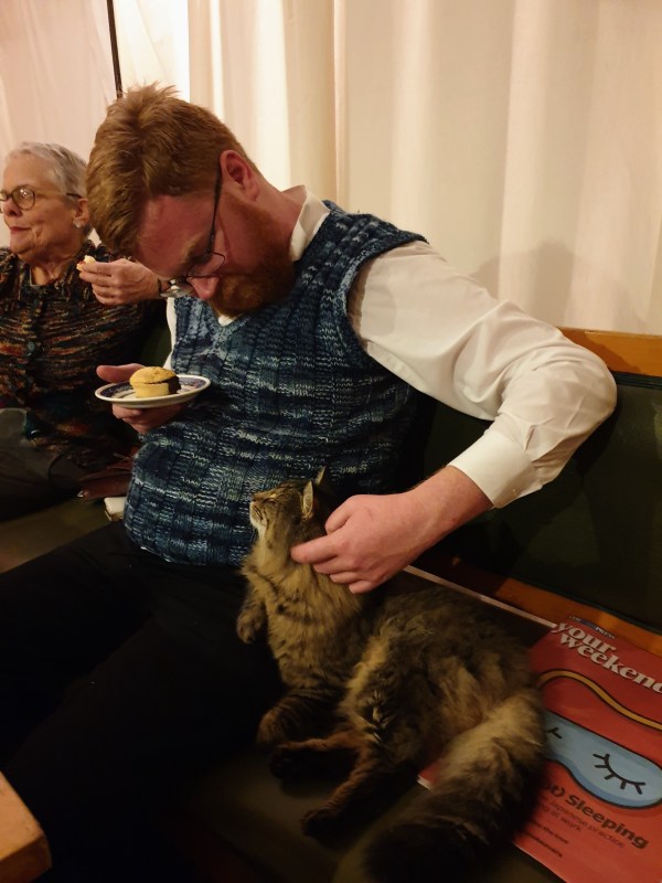 It was Jimmy the Theatre Cat! He had come into the station for some warmth and company. I was thrilled to meet him and to get lots of cuddles over course of the evening. He was most generous in sharing his time with all of us.