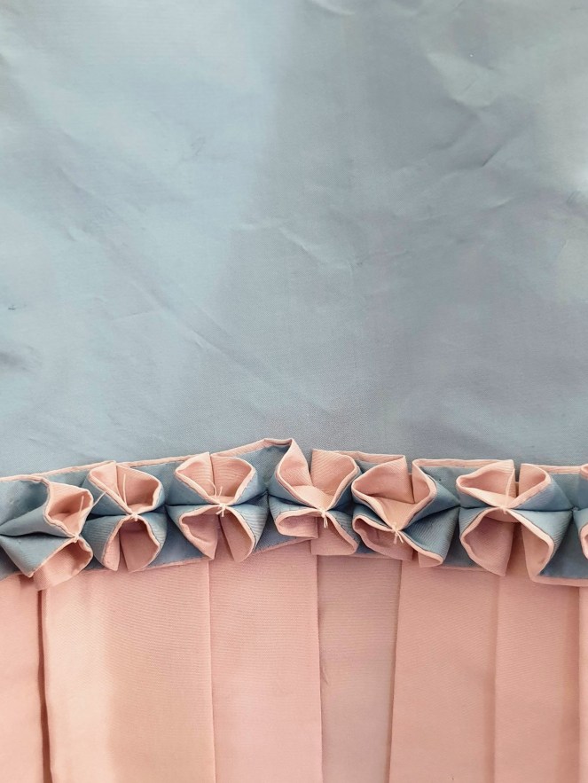 I could have been lazy and left it as was but it didn’t look quite finished. So, I took the plunge and started making up some trim to go along the top of the pleats and ruffles.