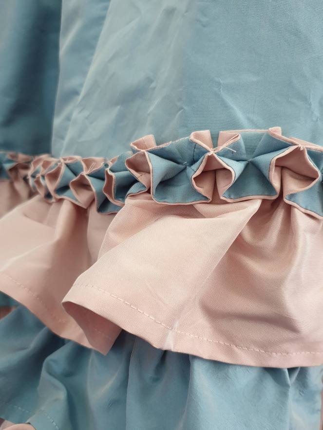 The ruffles at the back were originally going to be pleated but… guess who didn’t make the strips long enough? So, ruffles it was! Again, these were attached leaving a 1 inch space at the bottom for the hem.