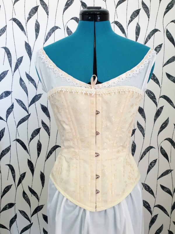 The size 10 corset is made from cream rosebud coutil with a cream lace trim.