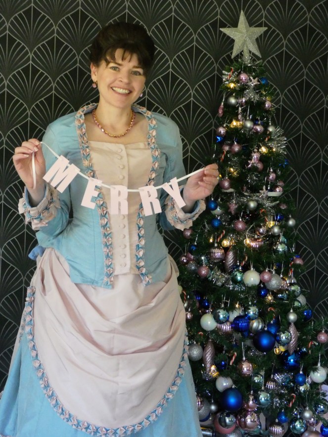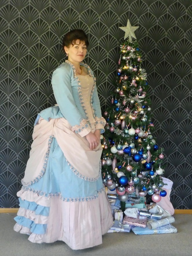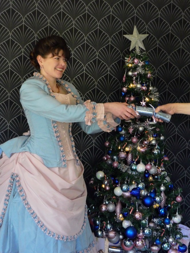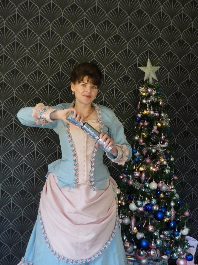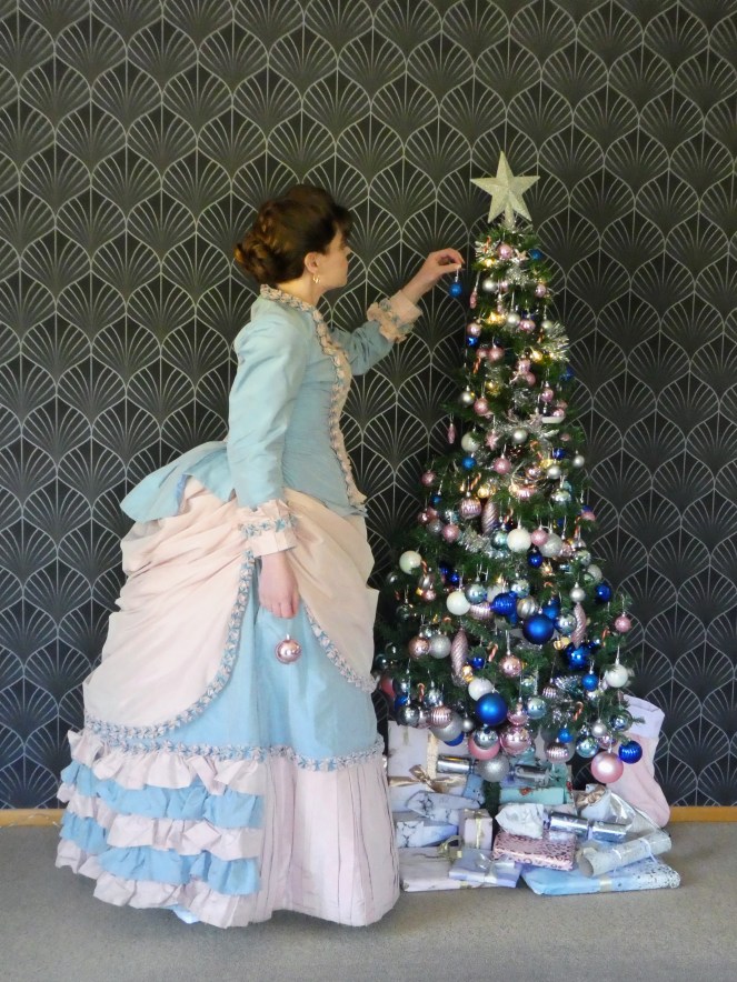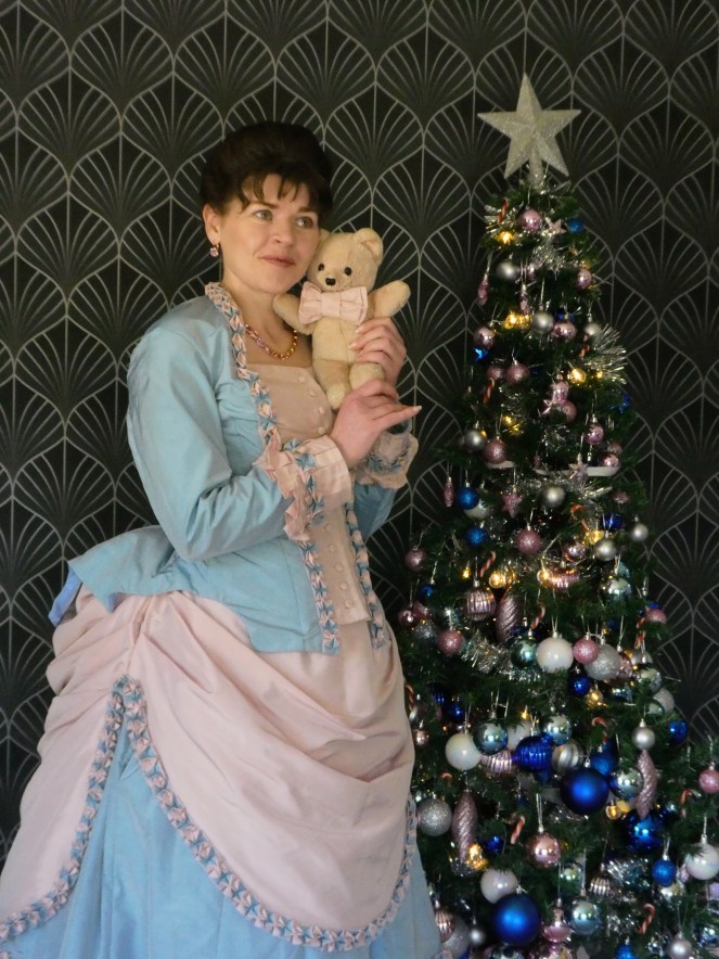 A lot of our Christmas traditions today were either started, influenced, or popularised by the Victorians. This gave me several ideas to work with – Christmas crackers, stockings, oranges, A Christmas Carol…and, of course, the tree itself. I also couldn’t help including Huggie, the teddy bear I was gifted for my first Christmas, and made him a bow tie to match my dress.
