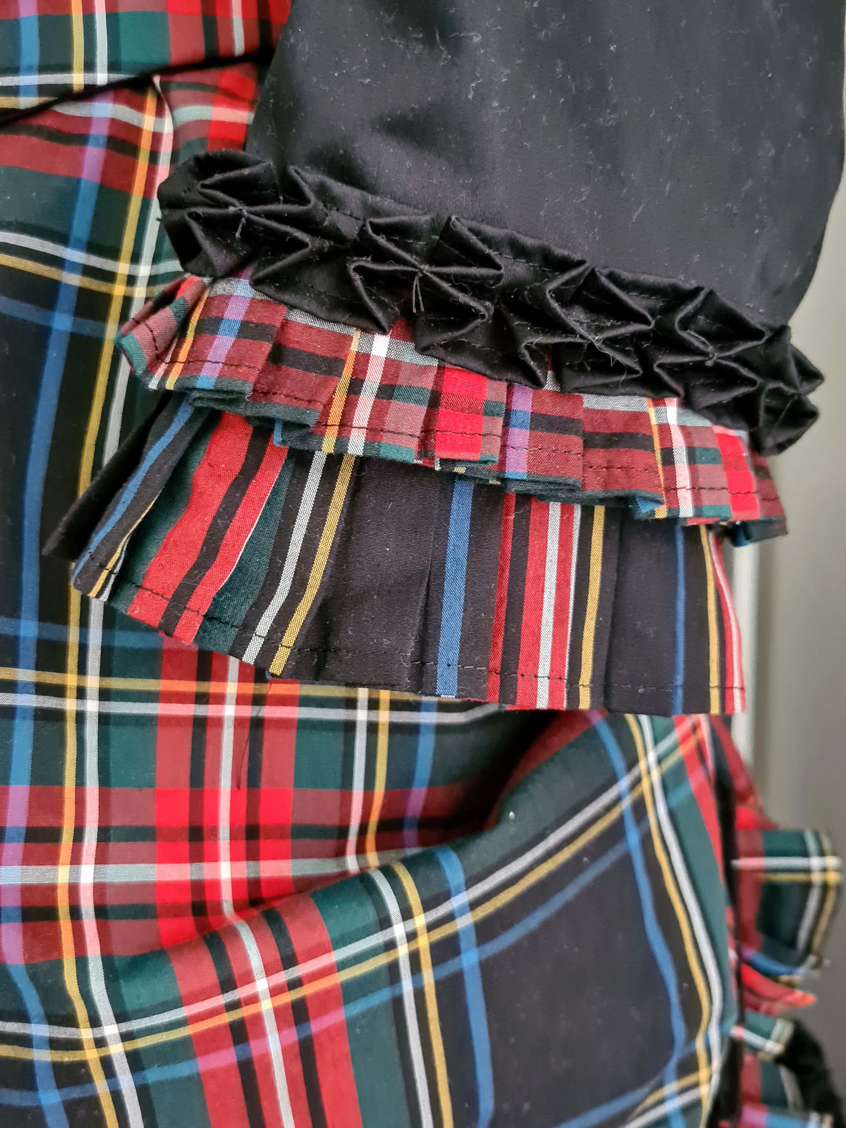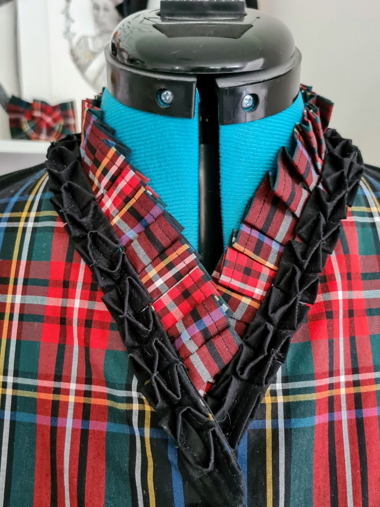 To strike a balance between the black and tartan, I chose to go with black sleeves, with pleated tartan cuffs and some more of the pulled box pleats as well.