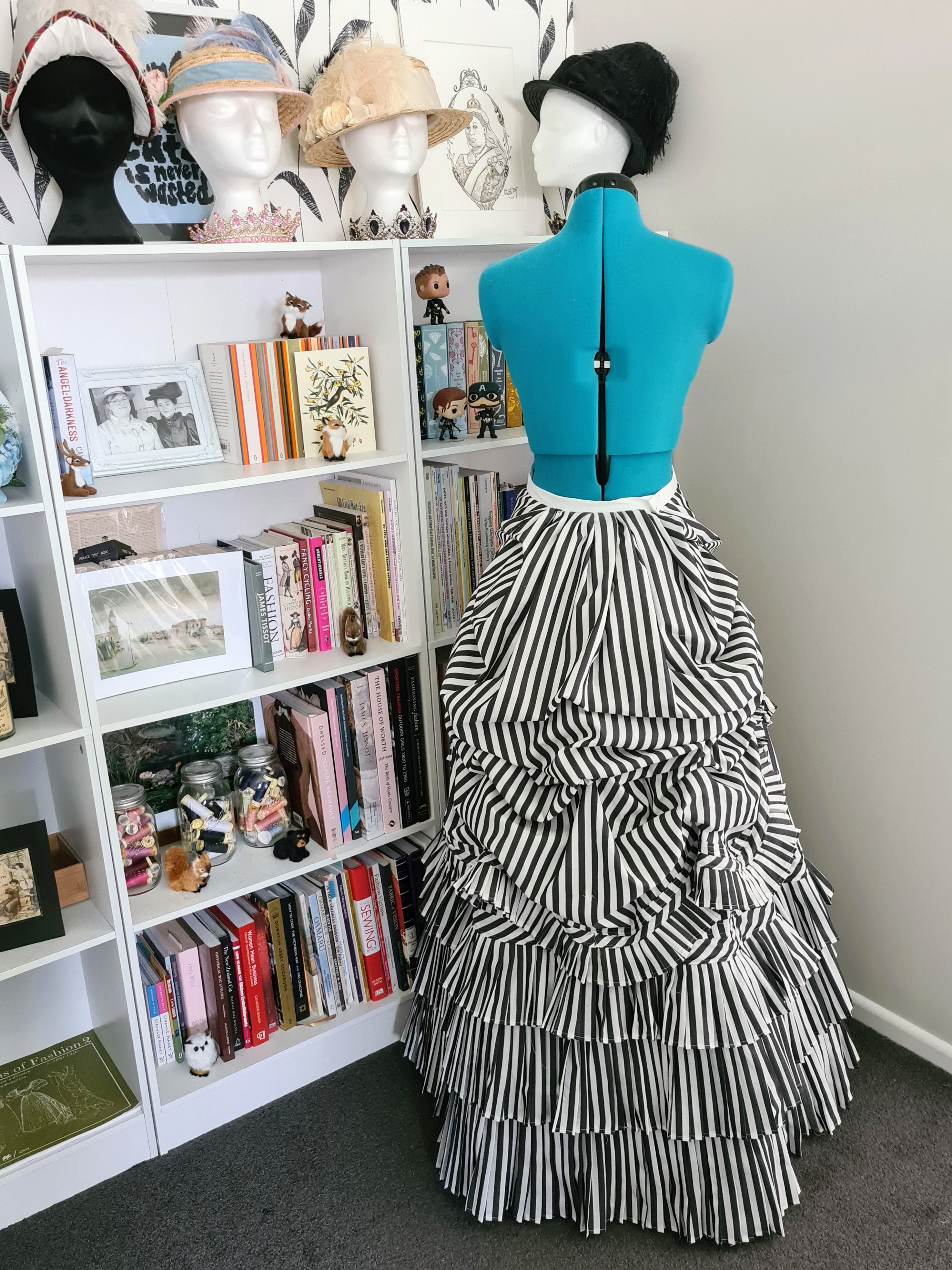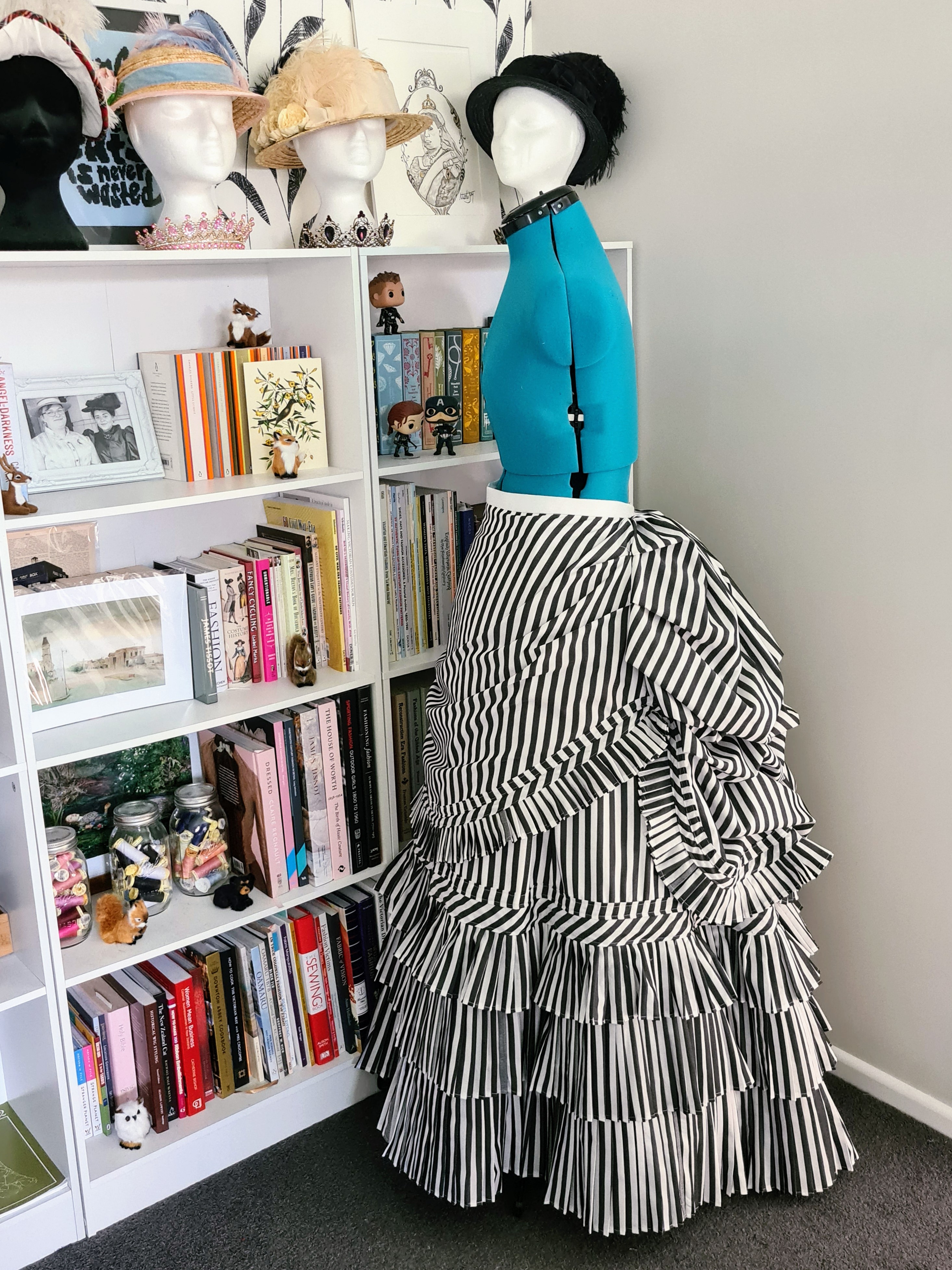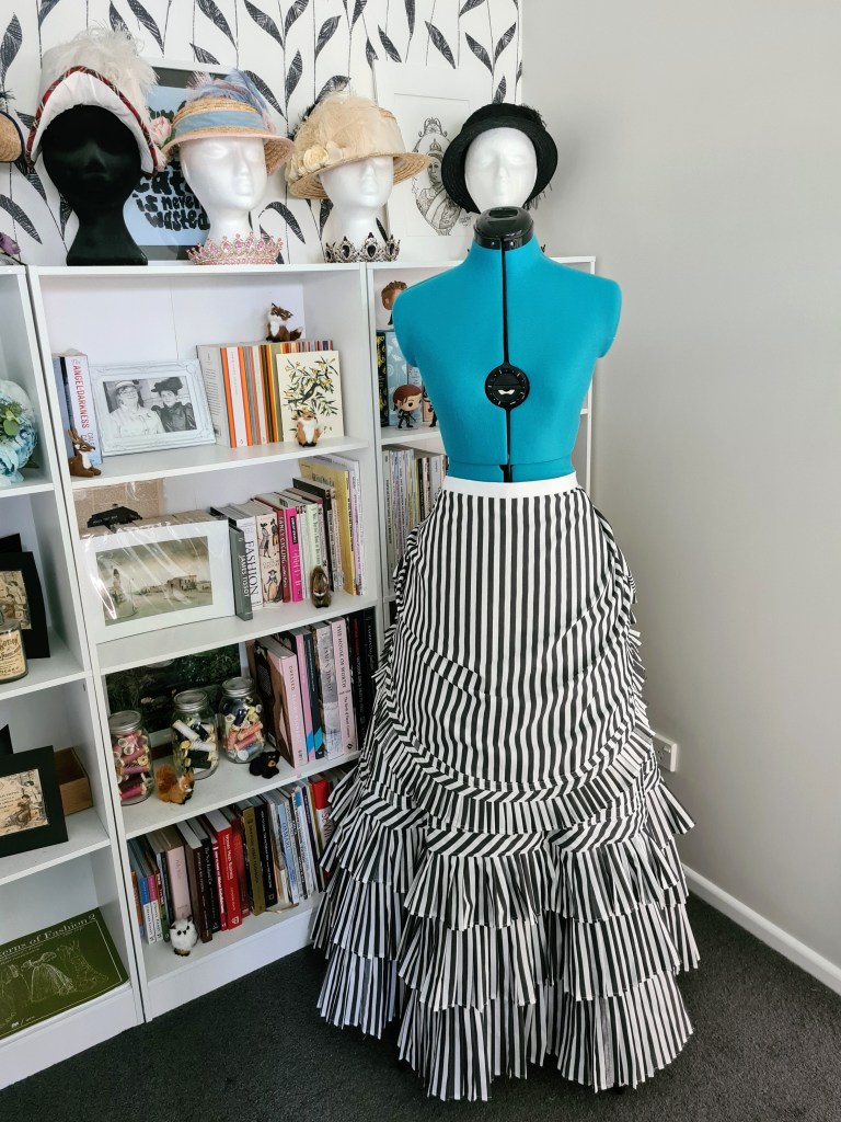 Once I worked the 1890s out of my system I threw myself back in time to the 1870s. I started working on my Tissot Striped Dress, making miles of pleated trim for it. I completed the Underskirt and Overskirt, and did make a start on the bodice, but that got put to one side as I lost a lot of my motivation and energy thanks to Covid invading the country again in August.