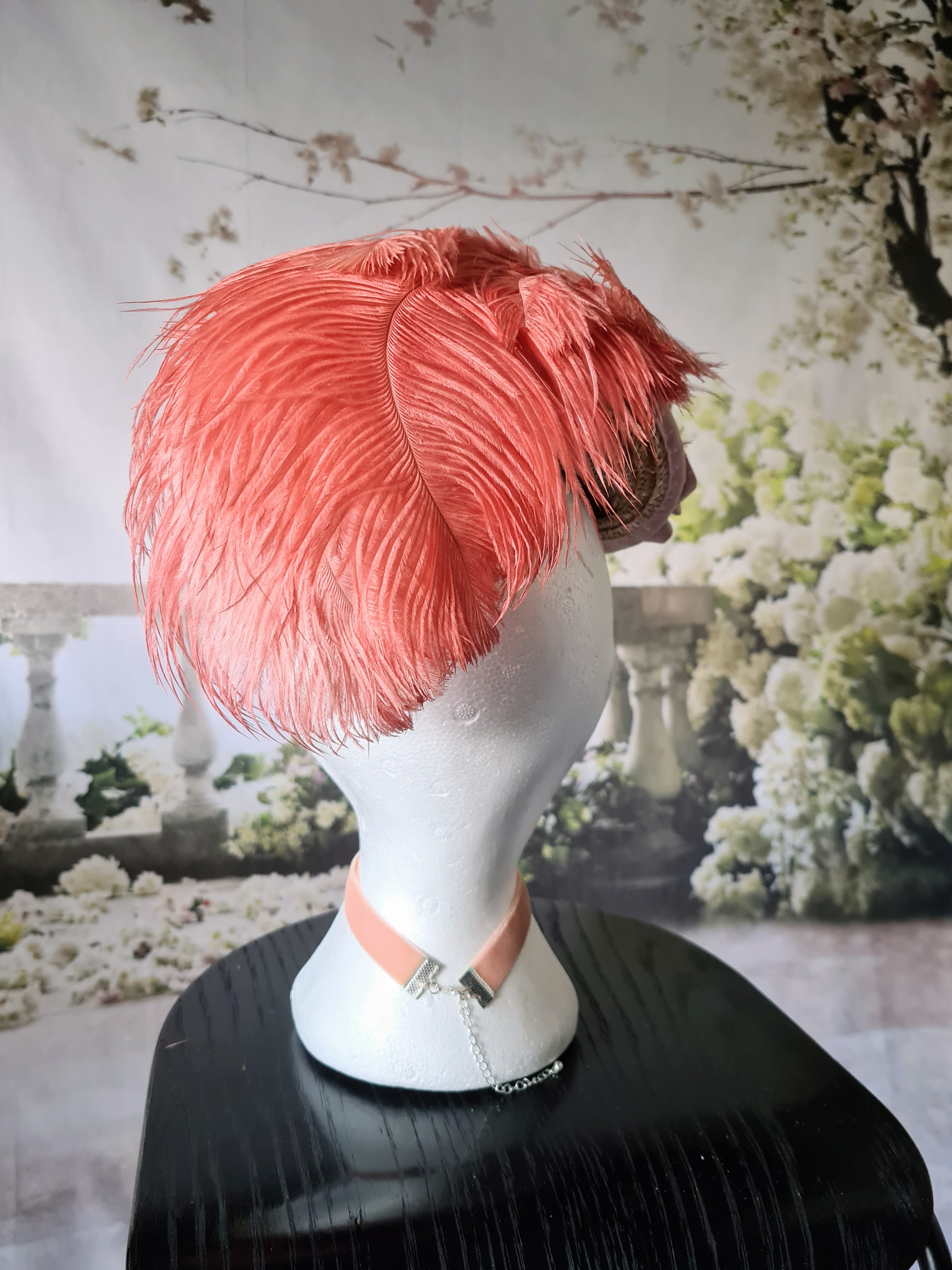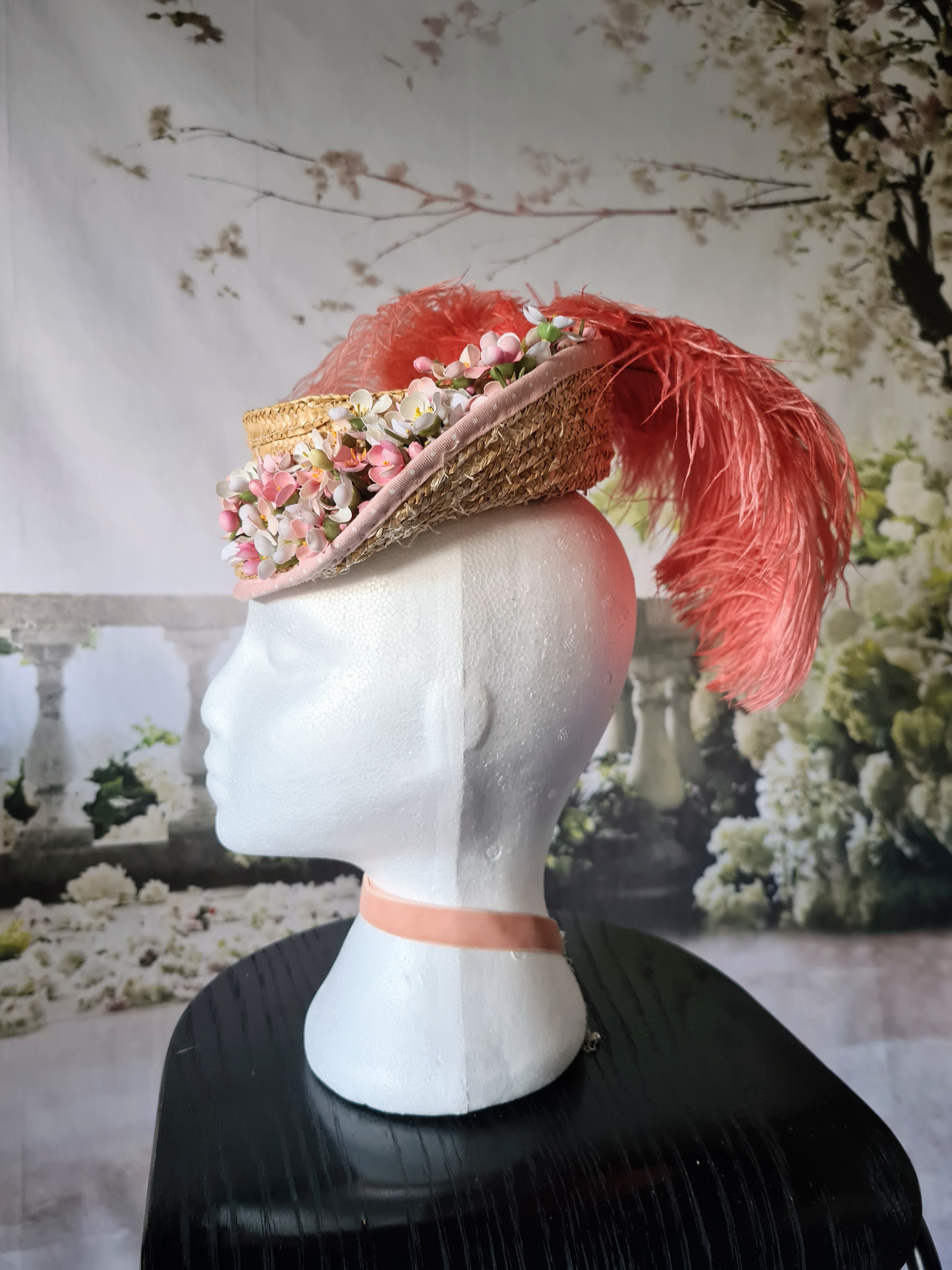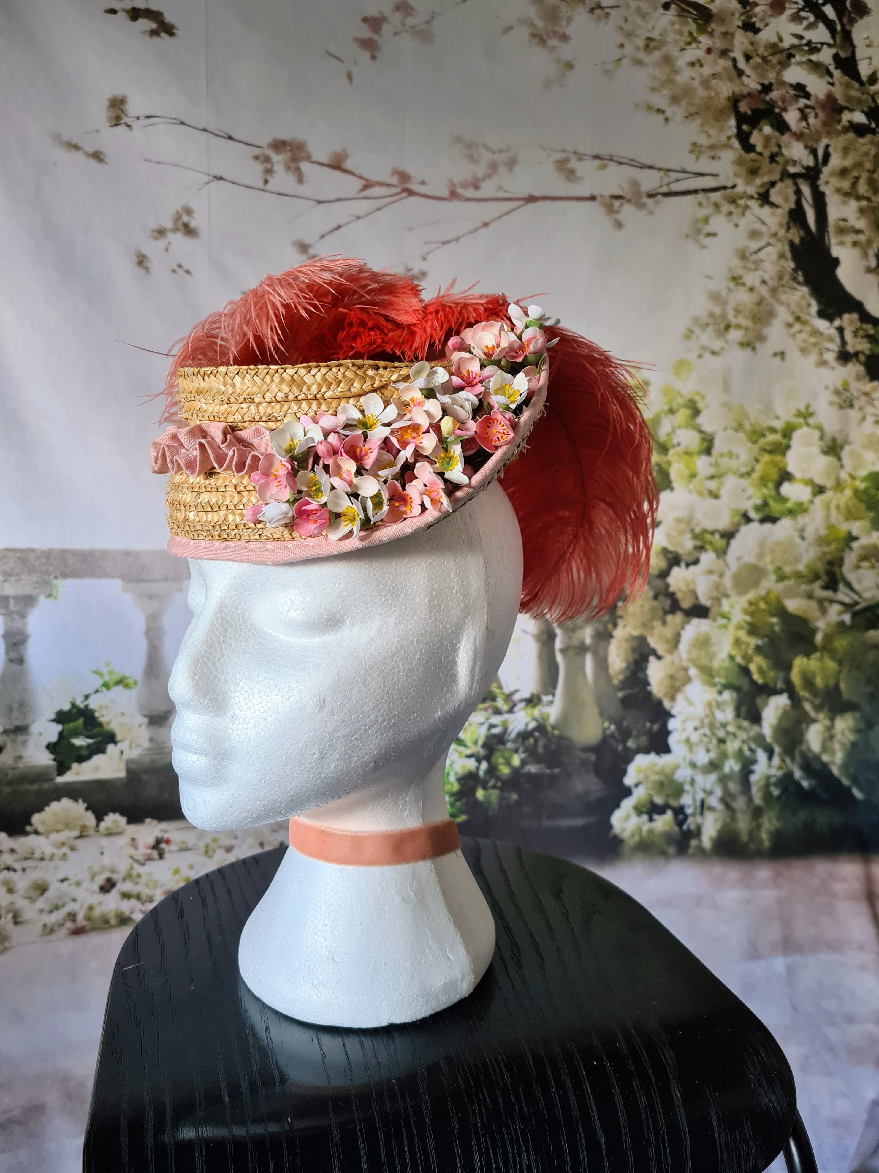 The feathers were arranged on the other side after great deliberation, and embellished with a self fabric flower (that was supposed to look like cherry blossoms but just look like nondescript flowers but that’s okay. I found a couple of larger feathers in my stash to curve over the back like some that I’ve seen in pictures (I like the hats of the period that have flowers, ribbons, etc trailing off the back).