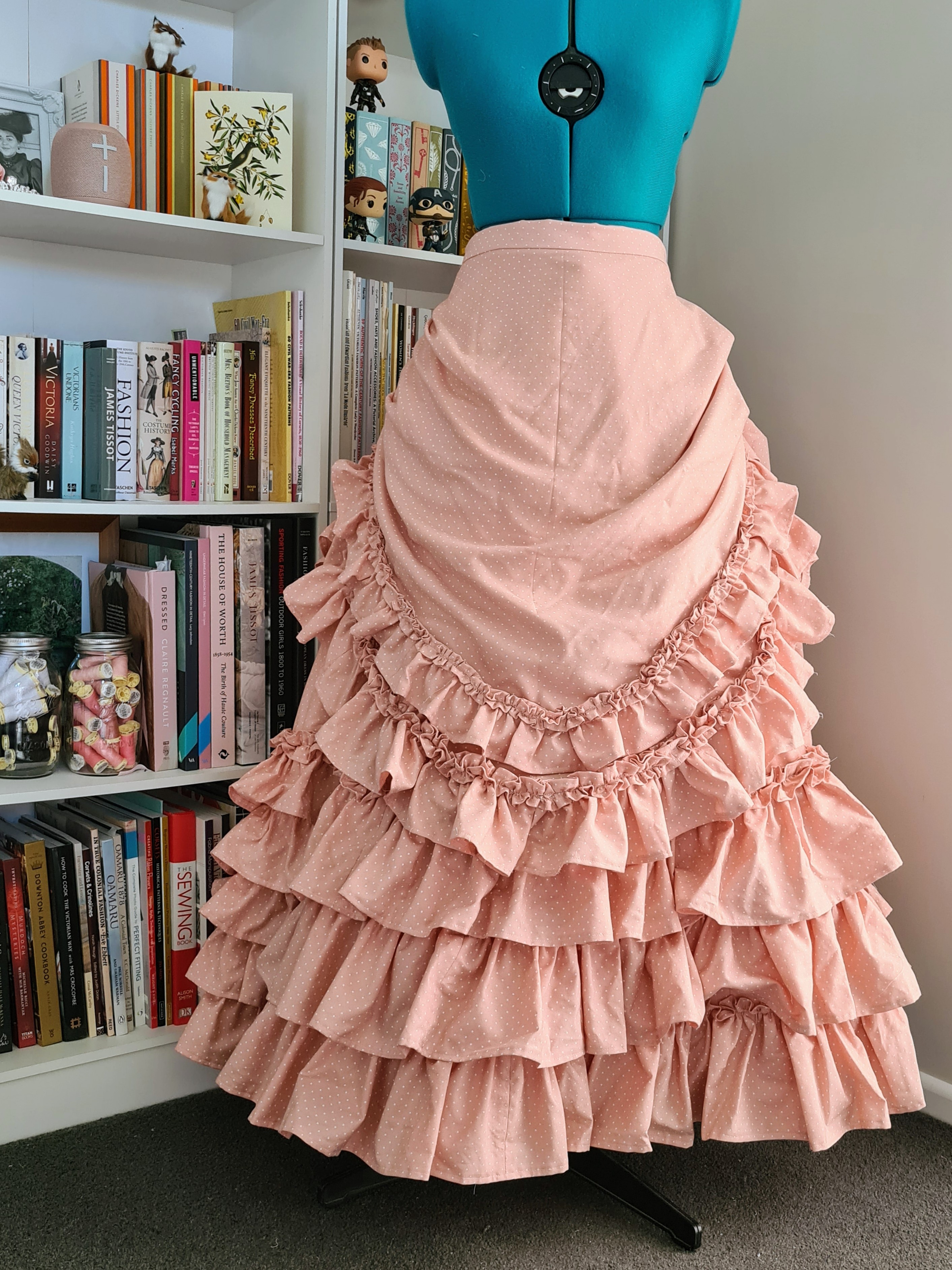 I added the ruffled trims to the upper portion of the overskirt before attaching it to the lower front piece. Then I joined the front with the back, added the ruffles to the hem all the way around.