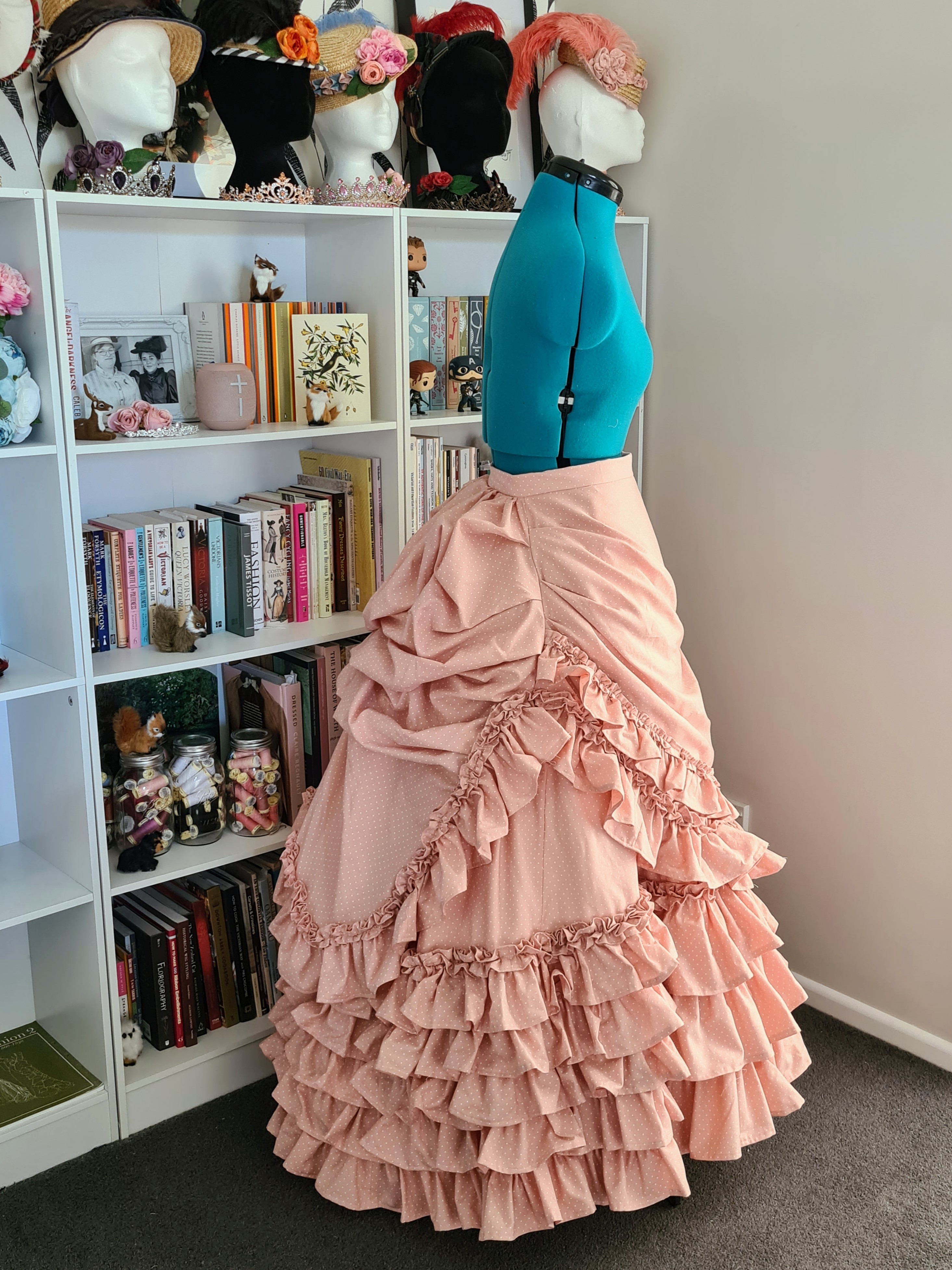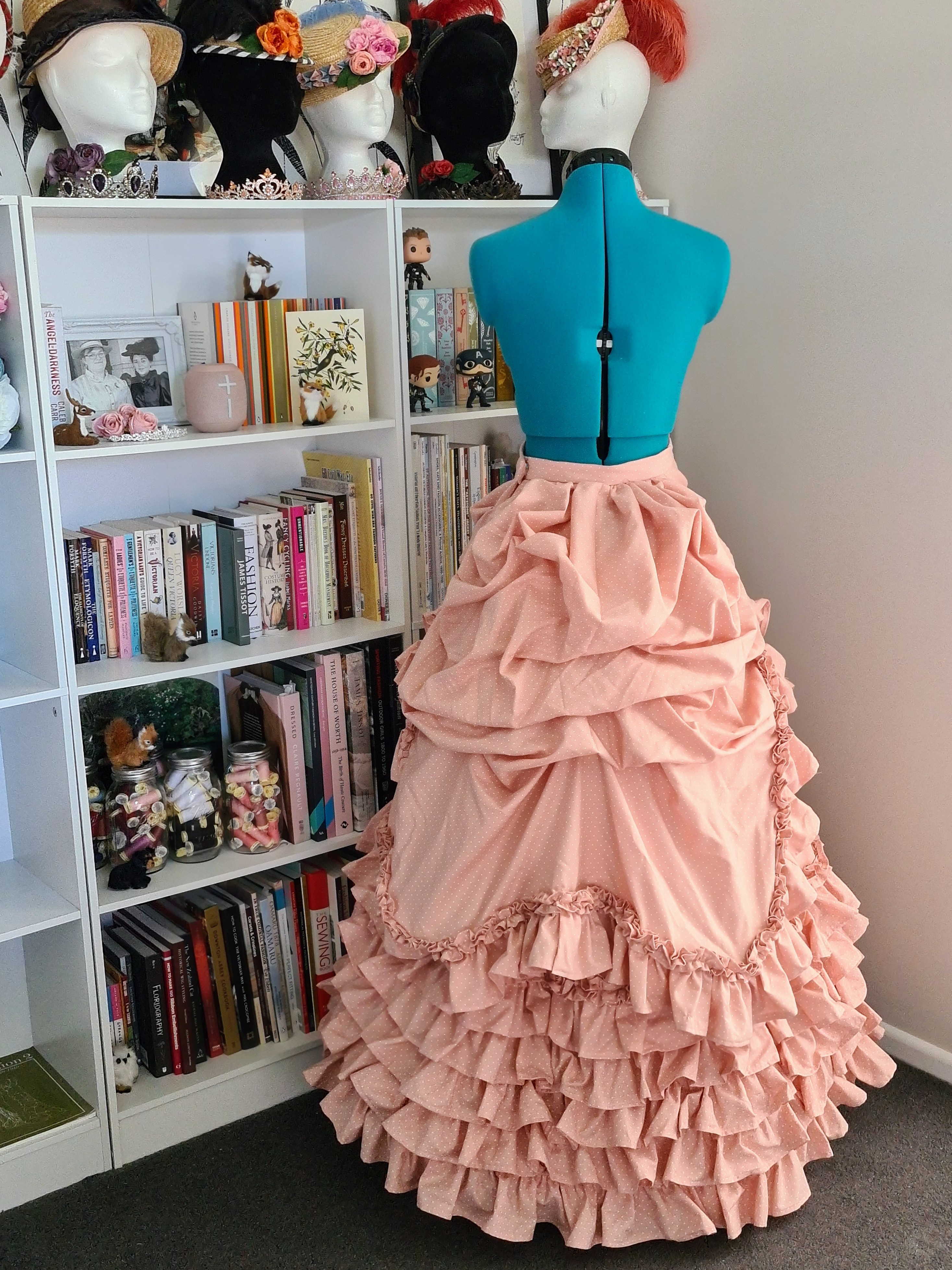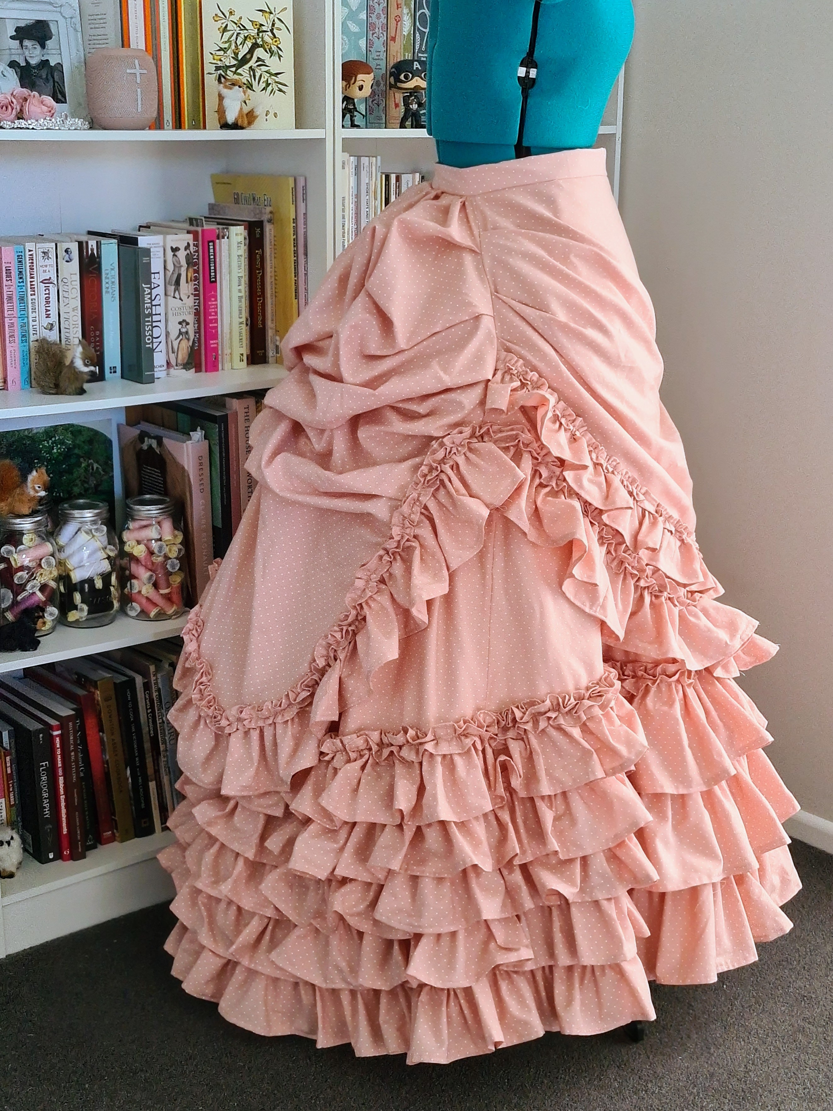 I used the Truly Victorian Bustled Apron Overskirt (TV305) but lengthened the back by a few inches so that I could gather it up more for more ‘fluff’, and used a shortened version of the front to create the upper portion.